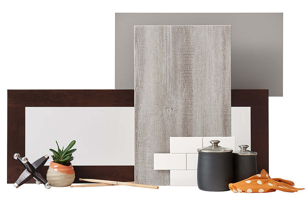 Hannah matte acrylic Urban, Anton textured woodgrain thermofoil Aged Oak Gray.