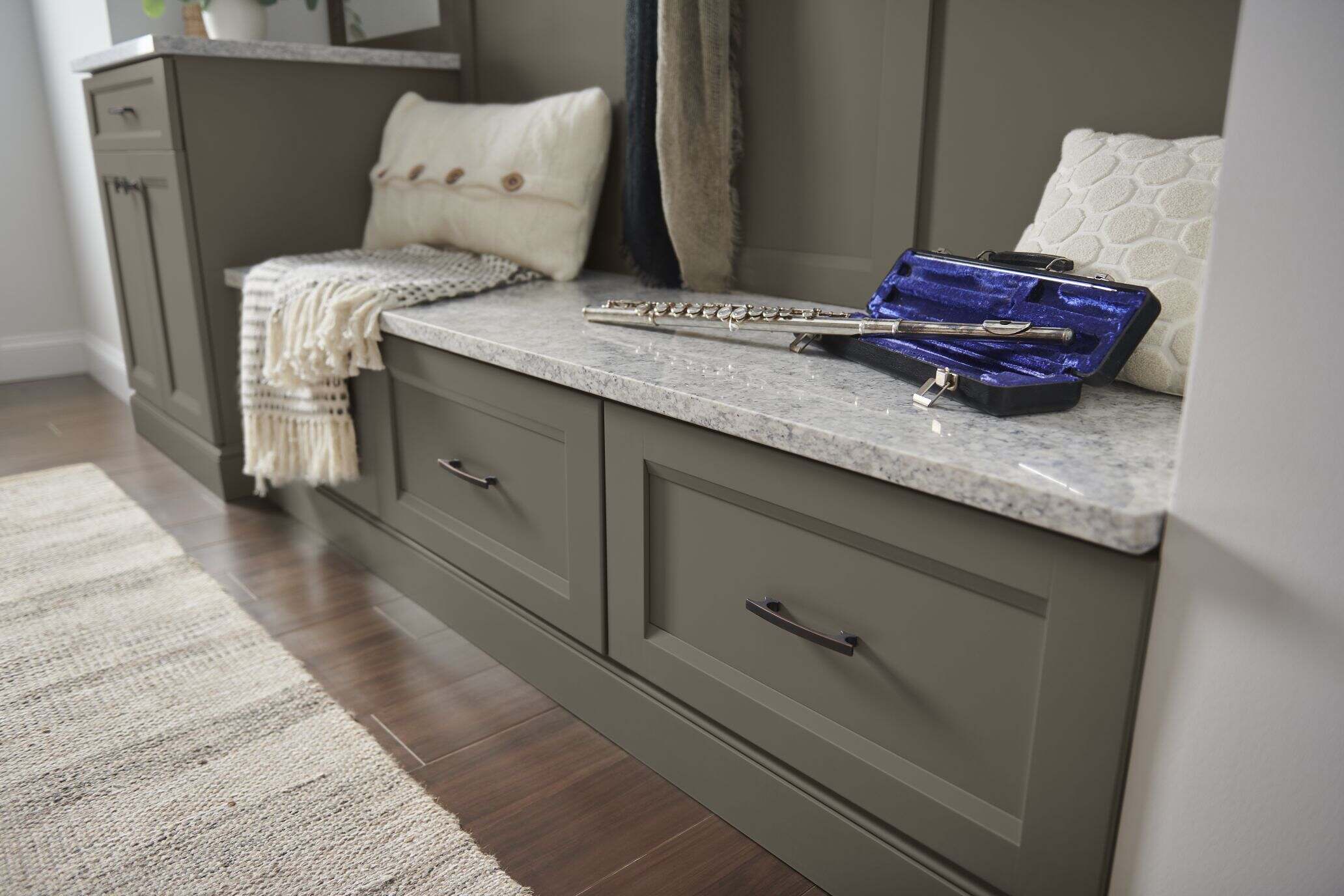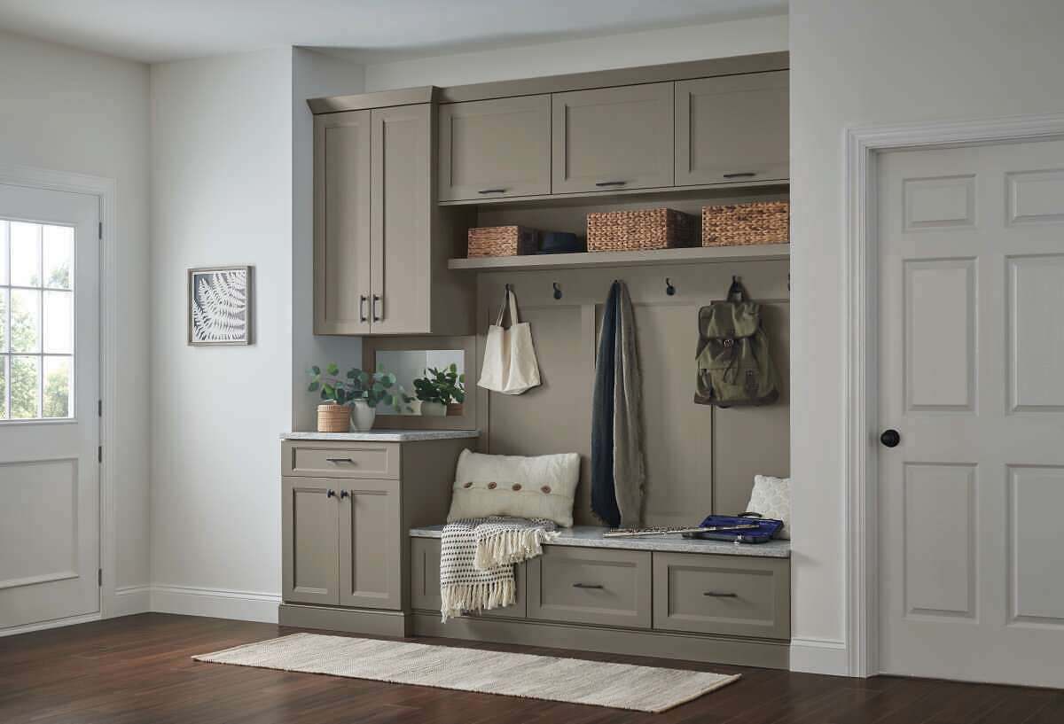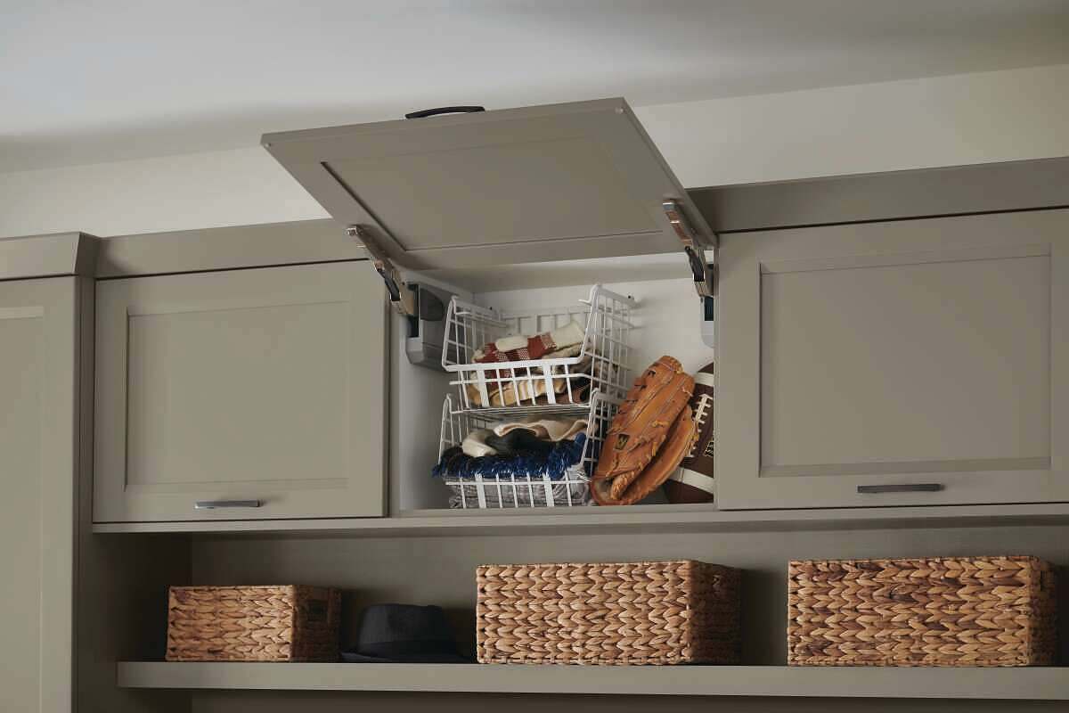 A boot bench with storage, including vertical lift upper cabinets, has room for every season’s wares—with it all tucked away. Keep your garments in check in a space made for you.