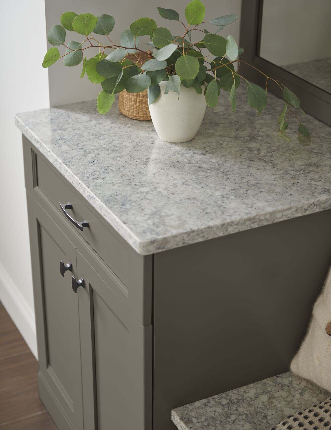 Popping out for band lessons, or home from vacation, it’s always nice to have an entry that is as welcoming as it is useful. Continue a quest for Transitional style and Farmhouse warmth with Shaker cabinets, and simple hardware.
