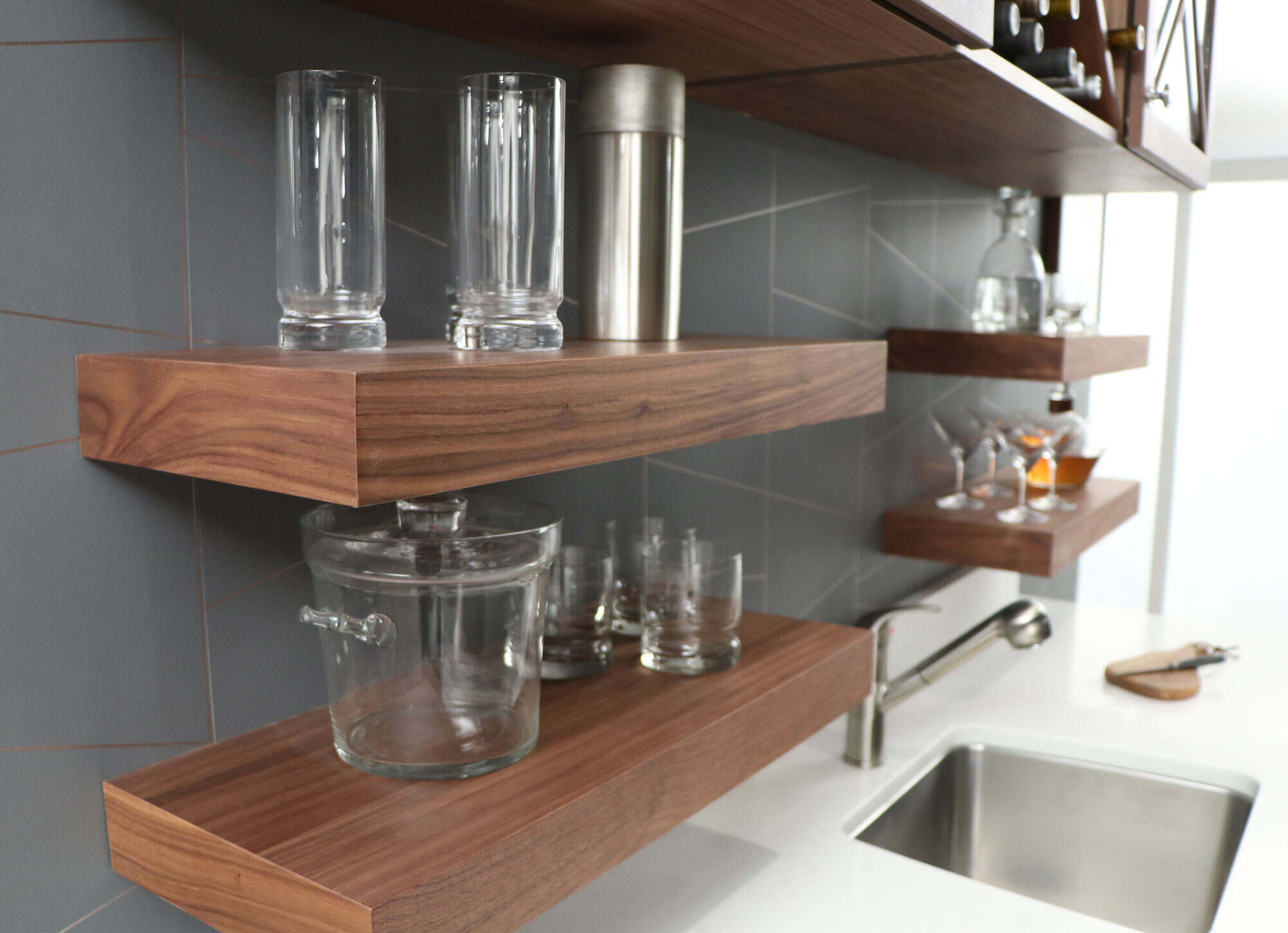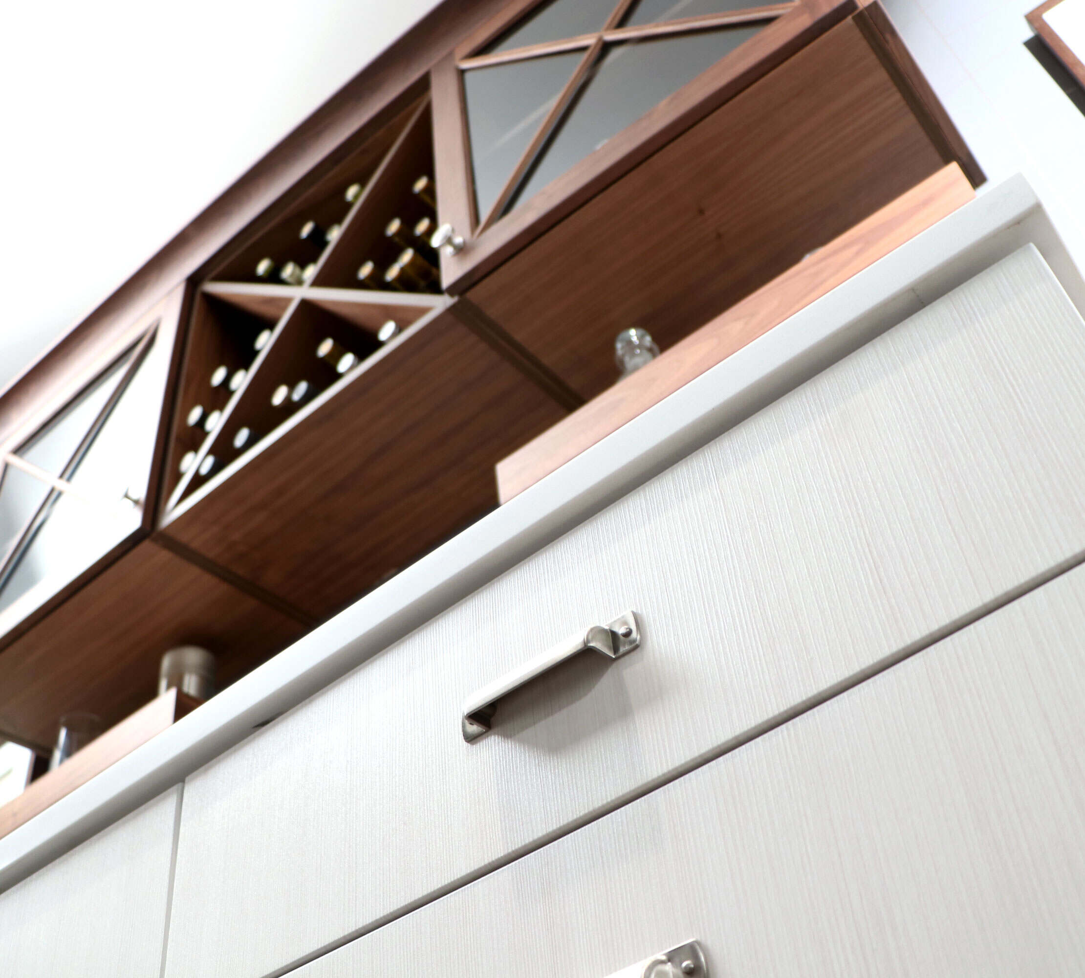 Don’t let that pesky empty wall get the best of you, now that you’ve decided to embrace an updated space. Get creative with 2lst century homestyle by turning unused space into a functional bar. Truman cabinets in rich walnut and distinctive Chi Mullions bring a Traditional flare when matched with an X-framed wine rack. Embrace Transitional design with a two-tone look by using Diva white textured woodgrain base cabinets, and show off your favorite spirits with floating shelves.